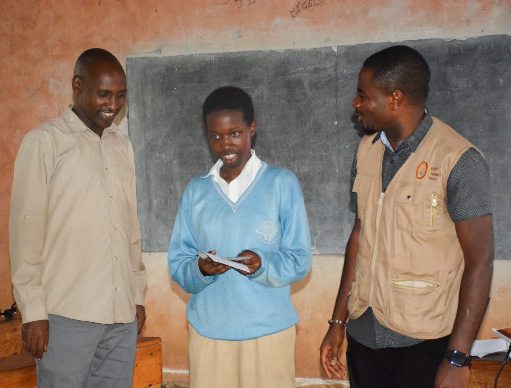 JUC staff presenting to Ntwari Sardoine the prize from African Jesuit AIDS Network at GS St Vincent Pallotti– Gikondo