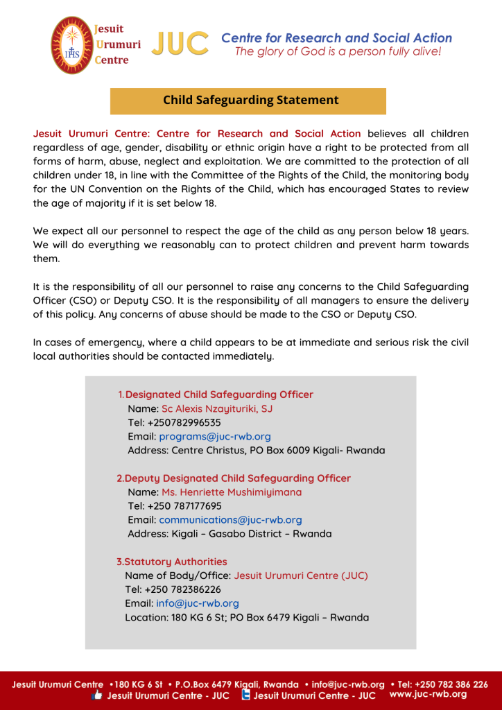 Jesuit Urumuri Centre: Centre for Research and Social Action believes all children regardless of age, gender, disability or ethnic origin have a right to be protected from all forms of harm, abuse, neglect and exploitation. We are committed to the protection of all children under 18, in line with the Committee of the Rights of the Child, the monitoring body for the UN Convention on the Rights of the Child, which has encouraged States to review the age of majority if it is set below 18.